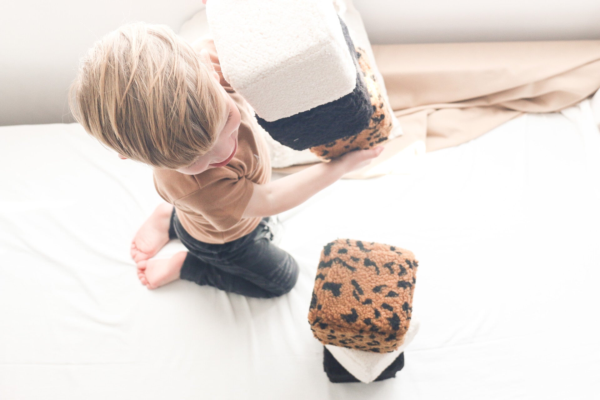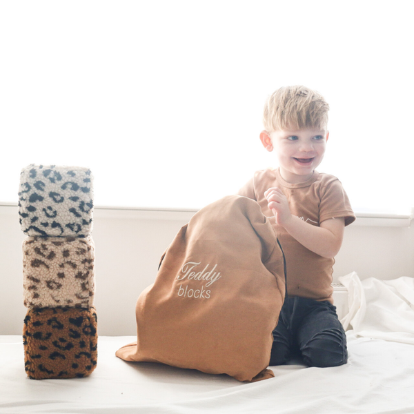 De teddy blocks worden in een katoenen bewaarzak geleverd. hierdoor zijn ze makkelijk op te bergen na het spelen.